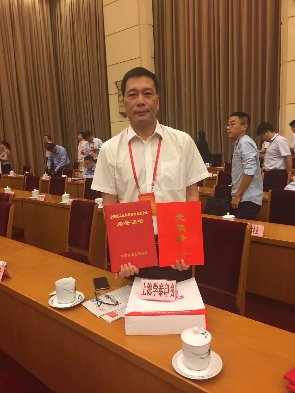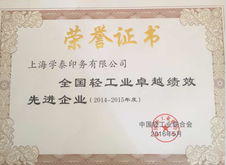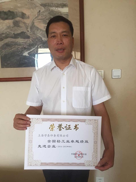 公司王總代表上海學(xué)泰印務(wù)有限公司領(lǐng)取“全國(guó)輕工業(yè)卓越績(jī)效先進(jìn)企業(yè)”榮譽(yù)證書(shū)